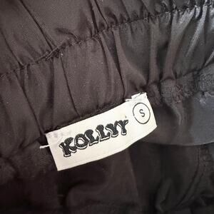 Size small from Kollyy. Black nylon harajuku style baggy gathered y2k windbreaker pants. Stretch band waist with drawstring. Preowned in good condition. Light signs of wear throughout.