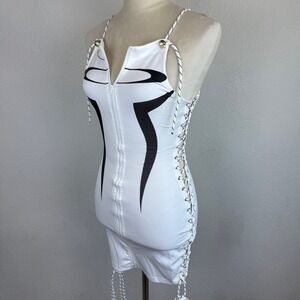 Command attention in this striking Kollyy mini dress, a vision in crisp white punctuated by bold black graphic prints. A full front zipper adds a touch of edgy functionality, while playful lace-up sides invite customization and ensure a figure-hugging silhouette. Adjustable shoulder straps. Imagine turning heads at your next festival, owning the dance floor at a rave, or making a bold cyber statement at a trendy night out. One very slight discoloration which shows in photo. Would wash out but I did not want to remove tags.
