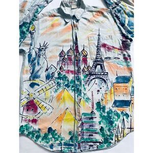 Item in Excellent Vintage Condition. Painted world view custom shirt, 100% cotton, White chambray style button-down, Lots of colors, Statue of Liberty, Eiffel Tower, Sydney Opera House, Red Square, Kyoto, Pyramids, Dutch windmills, Prague. Hand wash, soft, Unisex. Plez see the pics for exact size