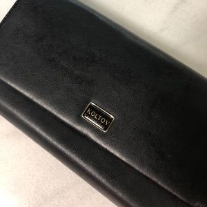 This is a beautiful clutch in perfect condition! Hold lots of things and is perfect for a formal event or travel. 11 inches wide, 6 inches tall and 2 1/2 wide but has some room for expansion.