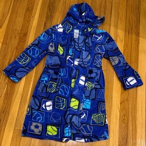 Cozy blue robe with sports pattern. Features hood and tie belt. Perfect for kids.