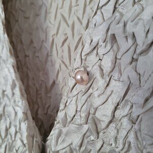 Turn heads in this ethereal Komarov two-piece set featuring a beautifully textured champagne satin finish with delicate lace inserts throughout. The top features intricate crinkled pleating with a softly structured collar, button-front closure, and subtly flared hem. The matching midi skirt flows effortlessly with a godet-style flare, incorporating semi-sheer floral lace panels for a romantic, vintage-inspired touch. Perfect for weddings, formal events, or any occasion where elegance is key.