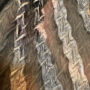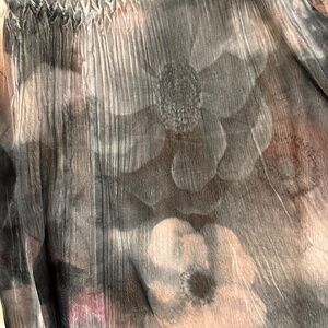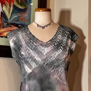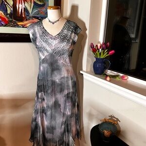 This Komarov dress is Gray/ Blue/ Pink Crinkle Chiffon that comes over its own attached underneath slip/ lining of pale gray crinkle crepe. Bodice is accented with diagonal ribbon-like stripes of satin and silver threads incorporated into the main fabric. There is a shadowy ombre floral print throughout the skirt section of the dress. This artistic dress is size P/L . It is a pullover the head style, loose fitting and very comfortable and easy to wear at the same time as being flattering. The special pleating and the way the dress is constructed make it adjust to the shape of the woman underneath in the hemline the dress has additional V shaped inserts that give full and flirty lines and movement to the skirt.