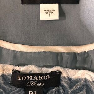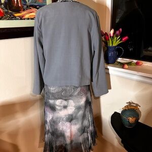 This lovely dress came to me with an Eileen Fisher Silk Jacket in a solid gray/ blue silk that co-ordinates perfectly with the dress. Because they go so well together I feel they should remain together. I have also had the personal experience of trying to find a little jacket to go over a similar Komarov Dress and they are difficult to find. So, for all these reasons, the jacket and dress are being sold together. Jacket w/ 3/4 length sleeves & pockets is lined in china silk. Labeled S but Eileen Fisher runs large & will easily fit same as the dress.