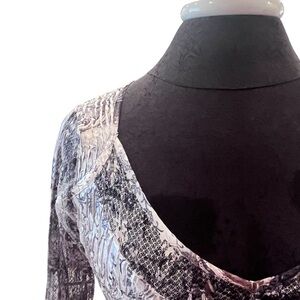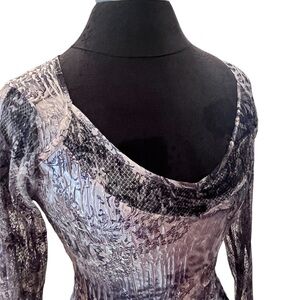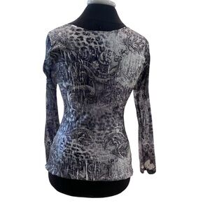 Excellent unworn condition. Measurements in photos. Fits a 34” bust. This elegant gray patterned top offers a stylish and comfortable fit. Perfect for any occasion, it adds a touch of sophistication to your wardrobe. It’s interesting neck detail is especially unique and characteristic of this special made in USA brand.