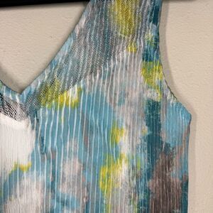 Komarov Maxi Dress Crinkle Mesh Blue Semi Sheer Watercolor, Fairycore, Girly, Stretch Material, Raw Hem, In Great Preowned Condition. Women’s Size Large