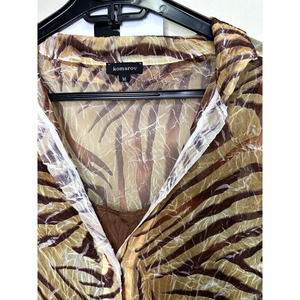 It features signature Komarov pleats fabric with exotic, timeless print, buttons front closure, attached liner in for of cami( can be detached