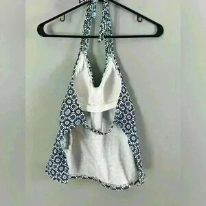 NWT. Shelf bra with cups. Closure in back. Adjustable tie halter neck. Navy and blue geometric pattern.