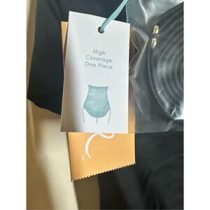 Elegant black one-piece with ruffle detail. Strapless design. Perfect for beach or pool.