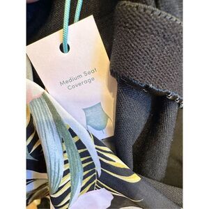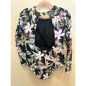Kona Sol Black and White Tropical Print Long Sleeve Rash Guard One Piece. Has removable padding. Size Medium. New with tag.