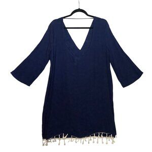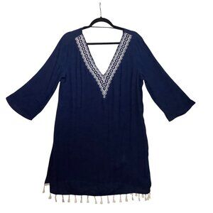 Kona Sol Boho Navy V-Neck Tunic Dress Beach Cover-up Women Large Trim Tassel Hem