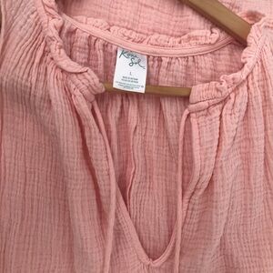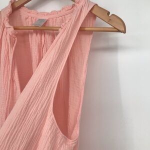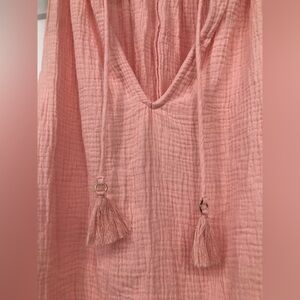 Kona Sol Gauzy Light Dress or Beach Cover Up. Peachy pink color. Tasseled ties in front. Little ruffle around neckline. Super light and comfortable for hot summer days or time on the beach or at the pool! Material is stretchy but I didn’t use any stretch when taking measurements. Layflat: Chest 20.5, waist 22”, bottom 28”, center back length 31.5”. Size Large