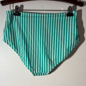 Kona Sol two piece swimsuit, green and white striped pattern. The high-waisted design offers a flattering fit. Size L