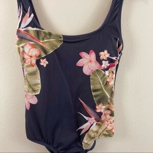 Kona Sol Grey Floral Ribbed One Piece Swimsuit Sz S Open Back Womens