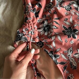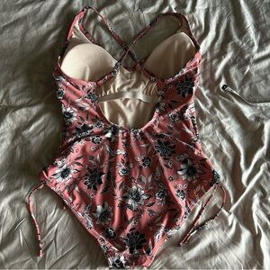 Super cute one-piece swimsuit with floral design. Features beige and black colors. Ideal for summer wear.