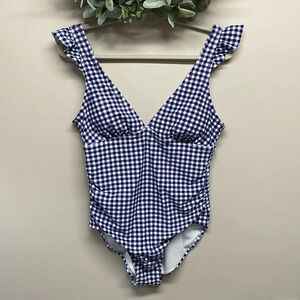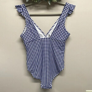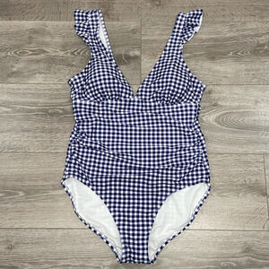 Kona Sol One Piece Swimsuit Blue and White Gingham Ruffle L