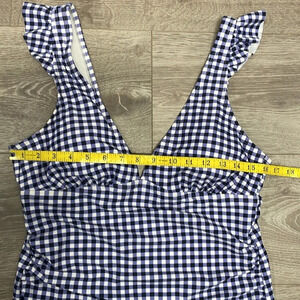 Kona Sol One Piece Swimsuit Blue and White Gingham in size L. Excellent like new condition, was tried on and then washed. First photo is stock photo. Removable cups, deep v-neckline, ruffled shoulder detail, full coverage seat. Please see photos for approximate measurements and details. Item may show difference in color based upon photography and perception. Photos are part of the description, as everyone’s level of condition may vary. From smoke free and pet free home. All packages are shipped the same or next business day.