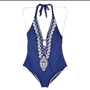 Kona Sol One Piece Swimsuit Navy Embroidered Plunge Bust Strappy Halter S New