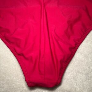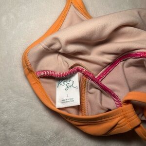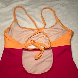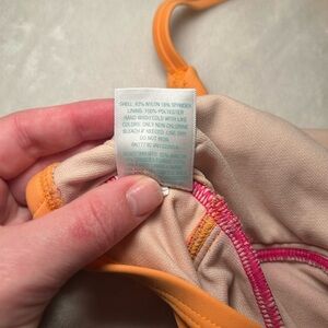 Stylish one-piece swimsuit by Kona Sol. Features vibrant orange and red color blocking. Perfect for a bold beach look.