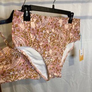 Brand new with tags, never worn! This Kona Sol bikini set features a pink and mustard paisley floral print. The bikini top has adjustable straps and light padding for support, while the bottoms are high-waisted with medium coverage for a flattering fit. A stylish and comfortable set, perfect for the pool, beach, or vacation.