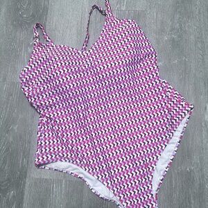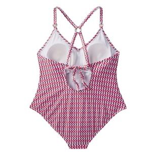 This stylish one piece swimsuit features a vibrant red and white pattern. Perfect for fun days at the pool or beach.