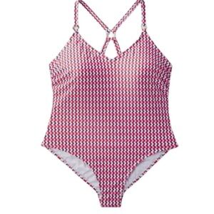 This stylish one piece swimsuit features a vibrant red and white pattern. Perfect for fun days at the pool or beach.