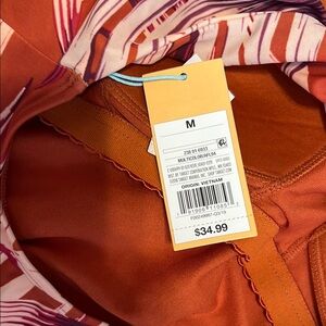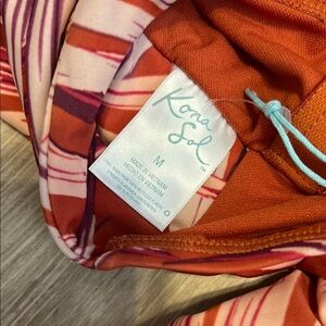 Stylish one-piece swimsuit by Kona Sol. Features a vibrant red base with pink and white palm leaf design. Perfect for beach days.