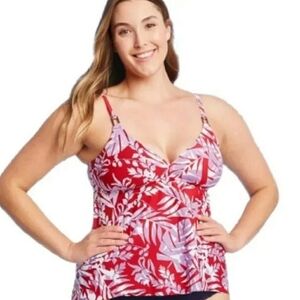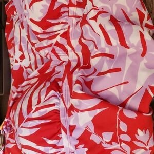 Kona Sol tankini top. Red with a light purple and white leaf print. Adjustable straps with removable bust padding. Pair with any bottom for fun in the 🌞 sun!