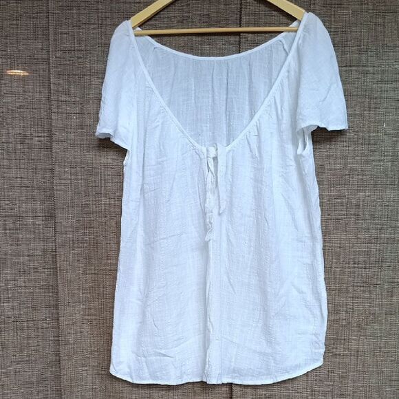 Soft white fabric with a textured design. Ideal for versatile styling. no size tag, feels like cotton rayon blend, 31" long, 25" pit to pit, measures xxl.