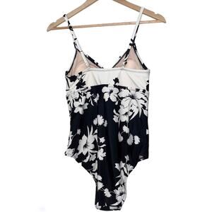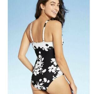 Kona Sol Tie Front One Piece Swimsuit - Size Medium - Black and White Floral