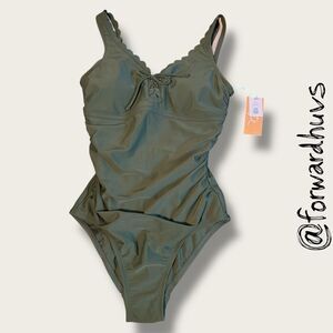 Kona Sol Tie-Front Ruched One-Piece Swimsuit – Olive Green – Size 4–6