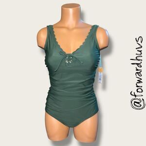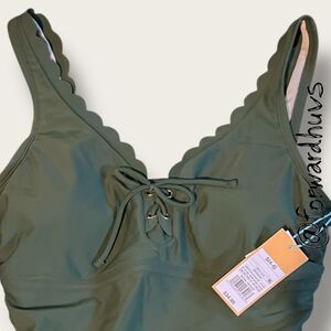 This brand new with tags Kona Sol one-piece swimsuit in olive green combines flattering design with full coverage and comfort. Featuring a plunging V-neckline and a tie-front detail, it’s styled with a ruched texture across the torso for a slimming and elegant effect. The open back with adjustable straps allows for a customized fit, while sewn-in cups provide gentle shaping and support.