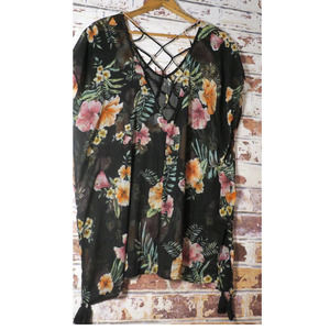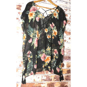 Kona Sol Tropical Print Sheer Lattice Back Tassel Hem Detail Kaftan Cover Up