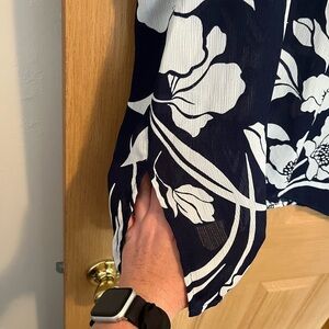It is white with a vibrant blue floral print pattern. It is a V-neck, has dolman sleeves and slits on the sides.