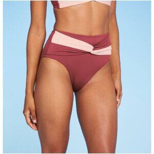 The high-rise design offers a little more coverage for confident wear and easy movement, while a colorblock twist front detail in pink and plum adds a little extra texture and interest to the look.