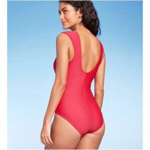 The Kona Sol Women's Full Coverage Cap Sleeve U-Wire One Piece Swimsuit in red combines elegance and support for a flattering swim look. Featuring a square neckline with U-wire notch, cap sleeves, tummy-control design, and full bottom coverage, this suit offers both style and comfort.
