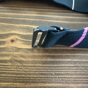 This pre-owned Kona Sol women's bikini top, size L, features a navy blue ribbed fabric with horizontal pink and white stripes. Triangle bralette style with a V-neckline and adjustable spaghetti straps. Lined with light pink fabric, it has an under-bust band and back clasp closure. Tag indicates made in Vietnam.