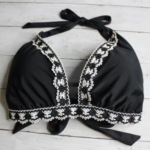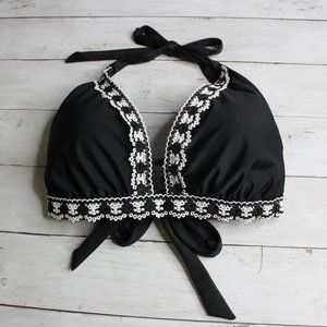 This swimsuit top is so cute with retro flare. It is solid black with black and white lace eyelet trim with two thin open bands in front. The soft breast cups have built in padding. It has halter straps that tie behind the neck and a back bra strap that ties. It is in excellent near to new condition. I think you'll love it!