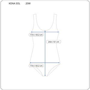 Kona Sol Women's Swimsuit is a one-piece black animal print swimsuit with spaghetti straps. The swimsuit is made of nylon and spandex material, which makes it stretchable and comfortable to wear. It features a built-in bra and is lined for added support and coverage. The swimsuit is designed for plus-size women and comes in size 20W. It is recommended to hand wash only.