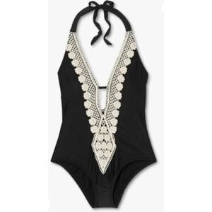 Kona Sol Women's LARGE Crochet Trim Plunge One Piece Swimsuit