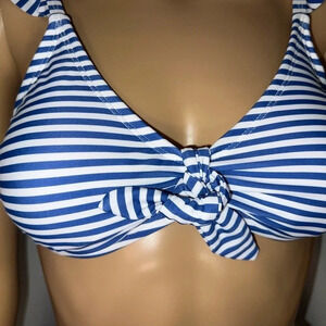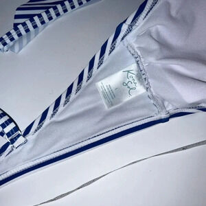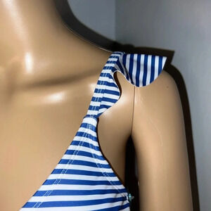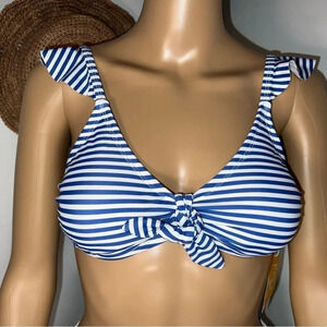 Kona Sol, XL, NWT, blue and white stripe front tie knot, ruffle caplet shoulder accent, adjustable straps, white buckle loop back closure