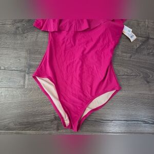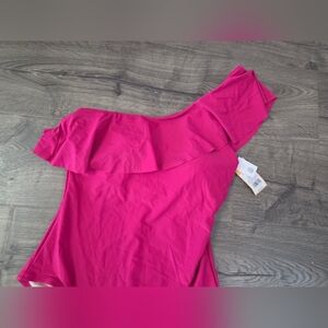 This stylish one shoulder swimsuit features a vibrant pink color, perfect for a day at the beach or pool. The ruffled design adds a beautiful touch.