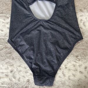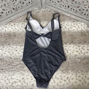This Kona Sol one piece swimsuit is black and silver with a sweet bow in the back. Wear it to the beach, a pool party, or on vacation. It is gently worn and is in excellent condition!