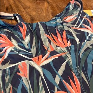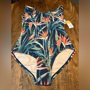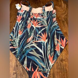 See pics for details. From bottom to bust, this one-piece has you covered. The higher neckline and full coverage bottom create a modest solution, but that is not all. The removable cups allow you to adjust the chest coverage based on your comfort level. Adjustable straps. Navy background.