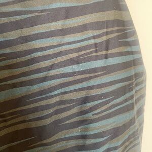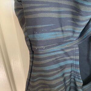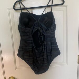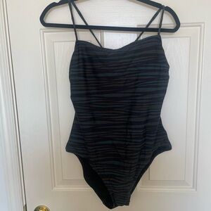 Kona Sol straight neck cinched back one piece swimsuit with green blue and black pattern similar to zebra print, regular rise and back cover, adjustable straps. Some wear shown in photos, priced to sell with discounted shipping.