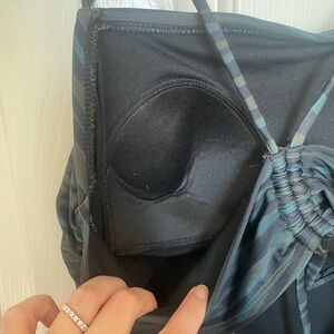 Kona Sol straight neck cinched back blue, green and black pattern one piece | L