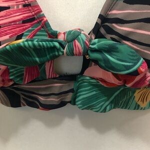 Kona Sol swimsuit bra top. Tropical floral print on black background. Double back hook straps. Soft cups. Adjustable shoulder straps. Very good pre-owned condition. Metal back hook shows some color loss as shown in picture. Size M. Measures 28 from end to end when lying flat.