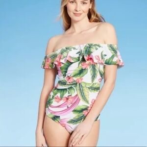 Kona Sol swimsuit Off Shoulder Flounce High Coverage One Piece Tropical