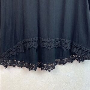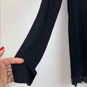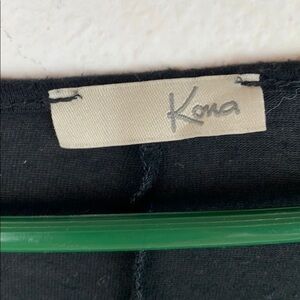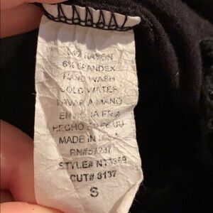 Jet black, photos lightened to show detail. super soft rayon spandex tee shirt with slender arms.