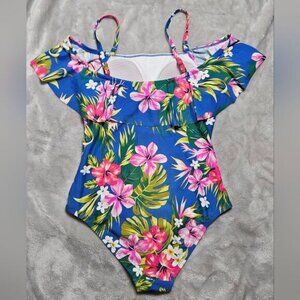 Kona Sol one-piece swimsuit in size S. Gorgeous tropical floral print in blue with off‑shoulder ruffle and adjustable straps. Made in Indonesia. Excellent pre-owned condition with no stains or damage.